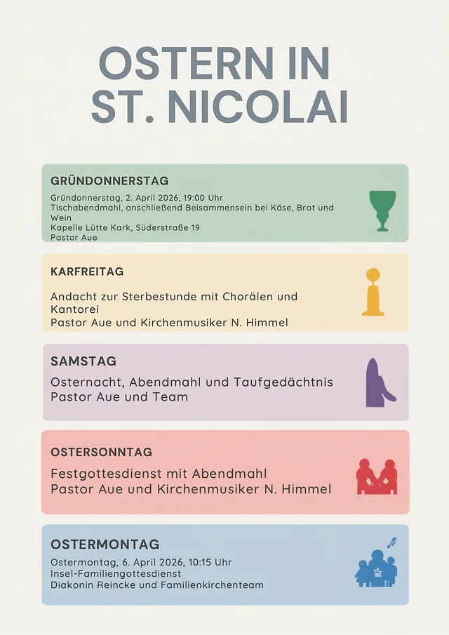 Am Sonntag feiern wir Gottesdienst – meist mit Abendmahl, getragen von einer vertrauten und zugleich lebendigen Liturgie. Dazu kommen Taizé-Andachten, Strandandachten unter freiem Himmel und in den Sommermonaten die Gute-Nacht-Kirche – ruhig, stärkend und oft ein besonderer Abschluss des Tages.